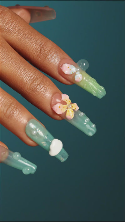 Tauche ein in ein märchenhaftes Unterwasserabenteuer mit Opal Bloom, wo zarte Blumenmuster auf den bezaubernden Reiz von Meerjungfrauen treffen. Dieses traumhafte, vom Ozean inspirierte Nageldesign verleiht deinen Fingerspitzen ein leichtes, luftiges Gefühl und ist perfekt, um deinem Look einen Hauch von Magie und Verspieltheit zu verleihen. Lass deine Nägel wie einen Meeresgarten erblühen und im Zauber des tiefen Blaus funkeln!