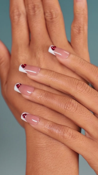 Sweet Heart Pink – nude and blue French tip press-on nails with red crystals