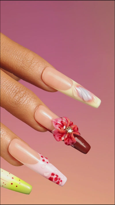 Bold, juicy, and blooming. With berry-red tones, 3D floral details, and dotted textures, Wildberry Petals is lush and eye-catching. A vibrant choice for festivals, date nights, or statement nail looks.