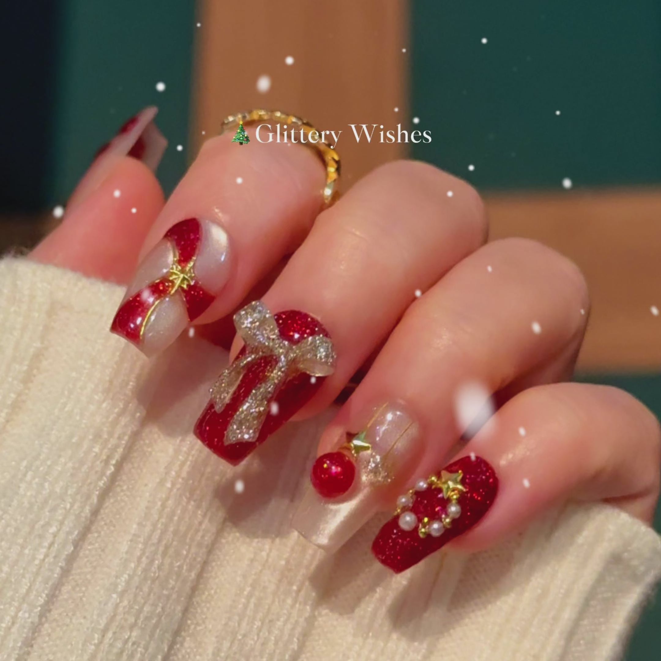 Wrap your fingertips like gifts with Glittery Wishes Christmas press-on nails. A charming blend of red and gold hues, complete with 3D bows, ornaments, and star motifs — every nail shines like a holiday wish come true.