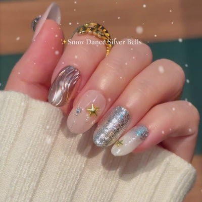 Celebrate the sparkle of the season with Snow Dance Silver Bells press-on nails. Featuring glitter silver, star charms, and gold swirl details, this soft neutral look adds subtle shine for Christmas, New Year’s Eve, or winter parties.
