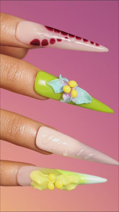 A bold symphony of colors and textures, Amber Gleam Tale celebrates the brilliance of nature’s palette. From amber-inspired reds and earthy neutrals to vivid lime green and sky blue tones, each nail is adorned with 3D floral sculptures that feel like blossoms glowing under sunlight.