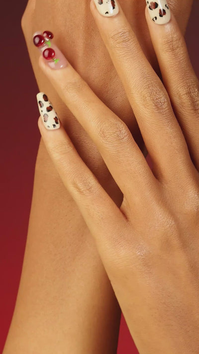 A playful mix of bold leopard print and glossy 3D cherries, crafted in a modern coffin shape. These press on nails blend wild and sweet energy for everyday confidence.