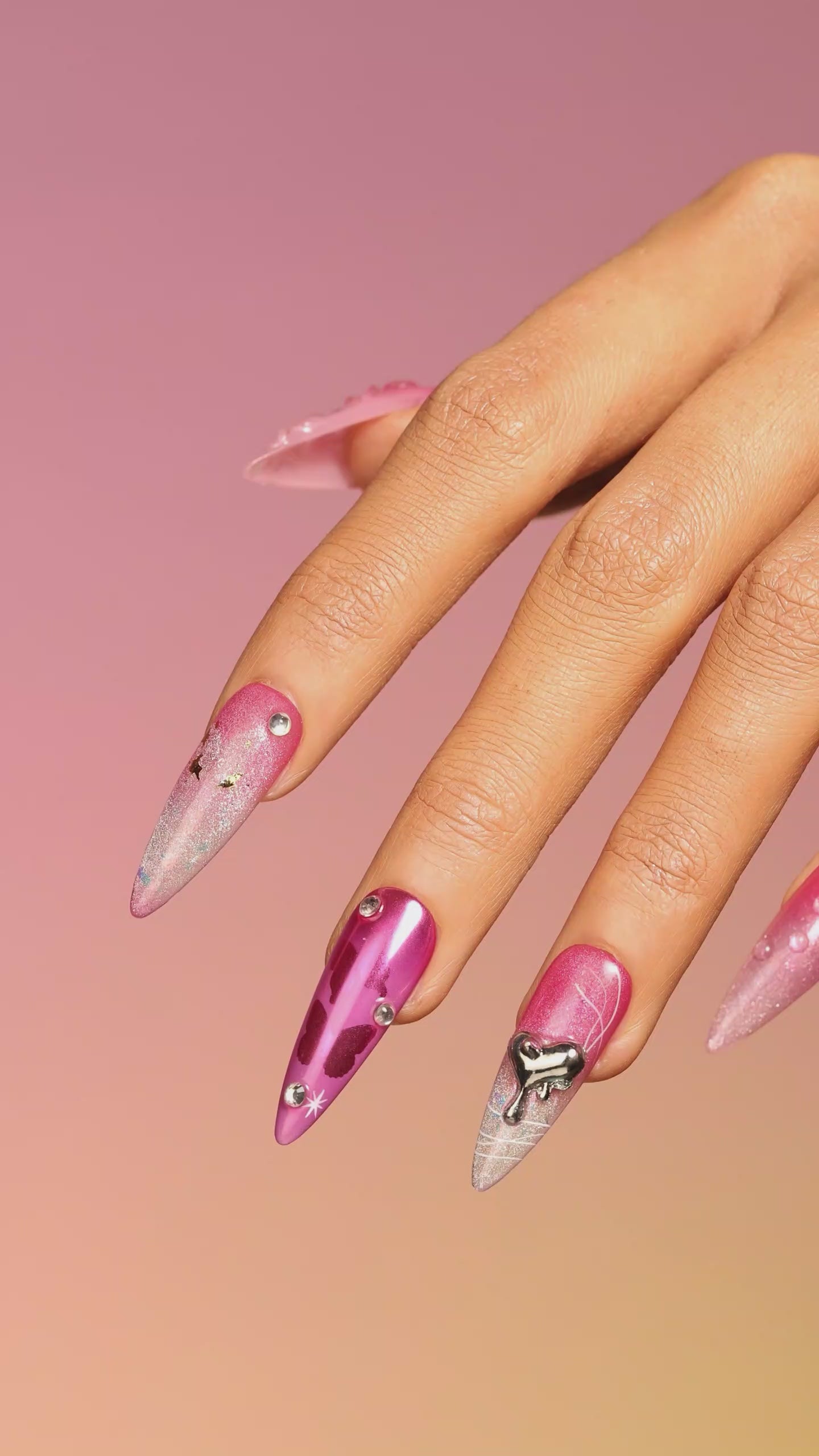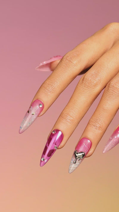 A dreamy blend of pink gradient, silver shimmer, and starry details, this set is designed to capture the elegance of a romantic night sky. With delicate teardrop accents, embossed floral patterns, and sparkling rhinestones, every nail shines with a touch of fantasy.