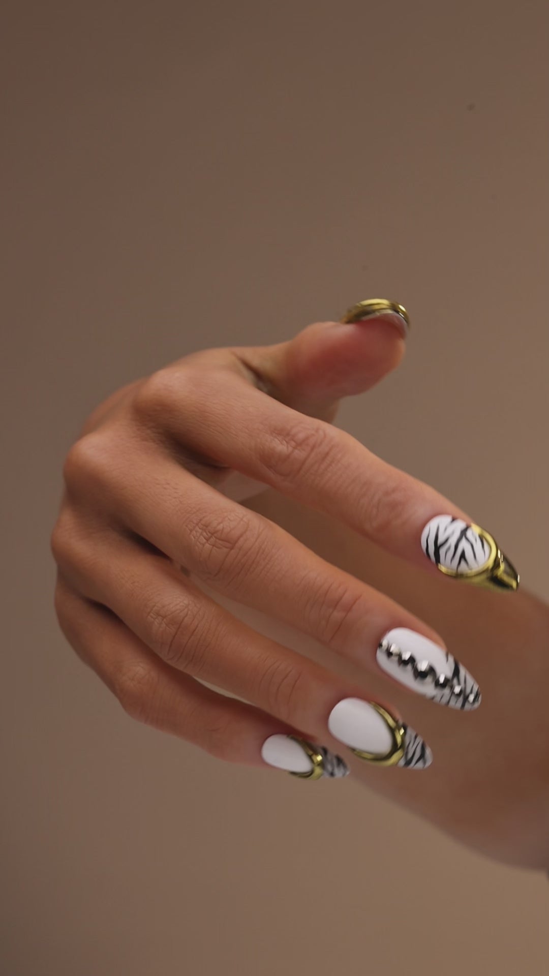 Refined and modern — Striped Elegance press-on nails showcase black zebra stripes with gold details for a confident, timeless manicure.